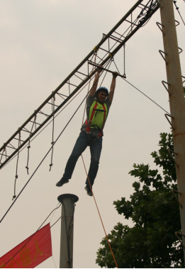 七米高的一个铁柱高耸着,另一边是悬空的半米横杆,我们要做的就是从铁柱上,跳起来握住相距1.5米远的横杆。