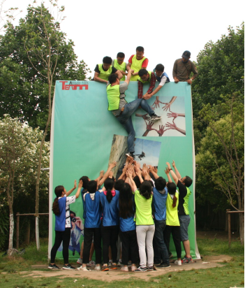 一堵高四米的墙,光滑、没有任何工具,要求所有的队员都翻越过去,才算胜利。当看着本来个人不可能完成的困难,被我们踏在了脚下,我们除了感动,还是感动,是什么力量使我们战胜了貌似不可能完成的困难呢?答案只有一个,那就是集体的力量,是团队的力量。